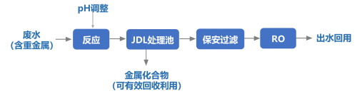 JDL工藝集固液分離、固體懸浮物濃縮、廢水處理回用、重金屬資源回收于一體,實(shí)現(xiàn)了“廢水處理回用+重金屬資源回收”的重金屬?gòu)U水處理模式;出水水質(zhì)達(dá)到相關(guān)行業(yè)重金屬?gòu)U水排放標(biāo)準(zhǔn),回收重金屬可作為相關(guān)產(chǎn)品直接利用,顯著減少了剩余危廢物,實(shí)現(xiàn)了廢水中有價(jià)金屬的資源化,一定程度上緩解了重金屬危廢處理難題;處理過(guò)程中不加入聚丙烯酰胺(PAM)、鐵鹽、鋁鹽等絮凝劑,使膜組件不易堵塞。
