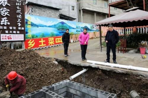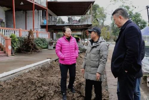 宋莉(中)現(xiàn)場(chǎng)查看截污干管建設(shè)和沿線商戶(hù)原有設(shè)施恢復(fù)情況