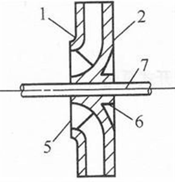 1一前蓋板;2一后蓋板;3一葉片;4葉槽; 1一吸人口;2一輪蓋;3一葉片5一吸水口;6一輪轂;7一泵軸 4一輪轂;5一軸孔