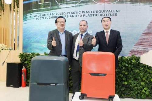 在蘇伊士展臺上,新秀麗集團(tuán)大中華區(qū)總裁馬瑞國、利安德巴賽爾中國合資企業(yè)管理及聚烯烴業(yè)務(wù)副總裁付立民、蘇伊士亞洲地區(qū)固廢資源管理固廢基建及新服務(wù)業(yè)務(wù)總監(jiān)古山主持揭幕儀式,攜手推出由回收塑料制成的可持續(xù)發(fā)展系列旅行箱,展示了三方共同致力于減少碳足跡,賦予塑料廢棄物第二次生命,減少原始材料的使用的愿景。