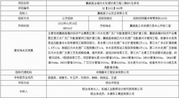 2月10日,河南省襄城縣全域污水處理環(huán)保工程二期EPC總承包(不見面開標(biāo))-結(jié)果公告-****標(biāo)段發(fā)布,中標(biāo)人為機械工業(yè)勘察設(shè)計研究院有限公司、中建科工集團有限公司聯(lián)合體,工期為24個月。